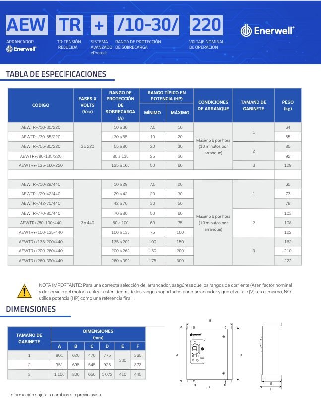 | Características | Ensamblado con componentes de control eléctrico de la más alta calidad marca Enerwell®, incrementa el cuidado de la red eléctrica, así como del motor, gracias al proceso de arranque en etapas (pasos) |