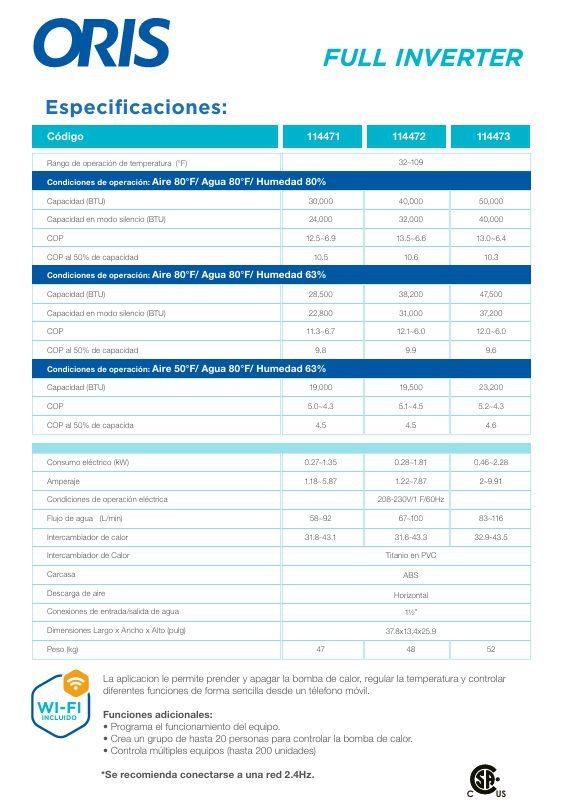 BOMBA DE CALOR ORIS 50,000 BTUS